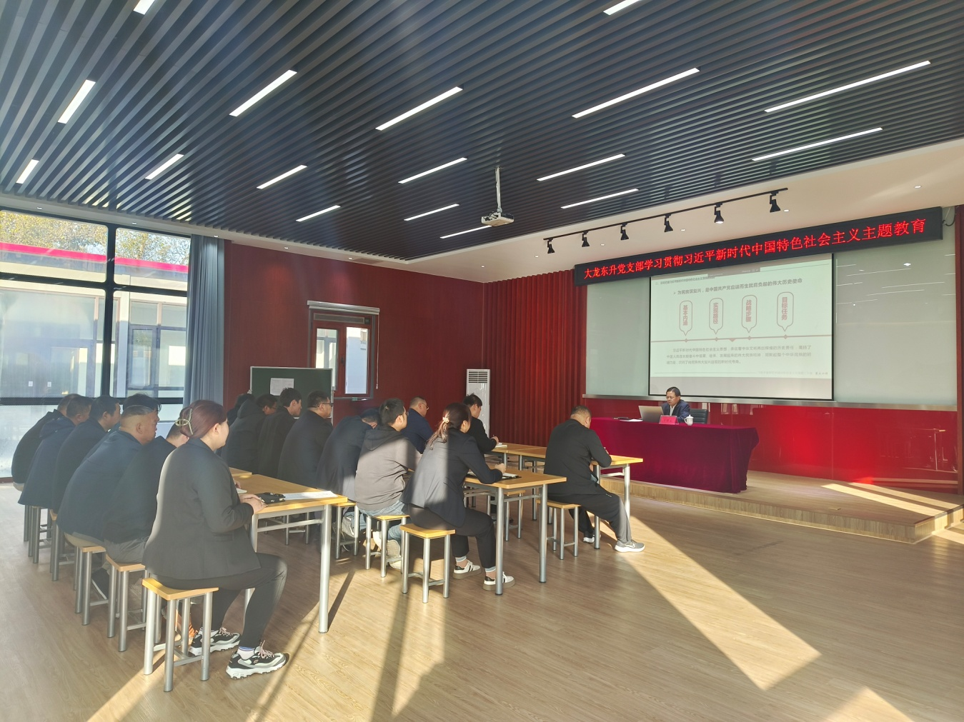 为深入扎实开展学习贯彻习近平新时代中国特色社会主义思想主题教育,10月26日,大龙东升党支部在公司展厅会议室召开全体党员大会,大龙控股副经理宋保生同志到大龙东升党支部指导主题教育工作,并为全体党员讲专题党课。